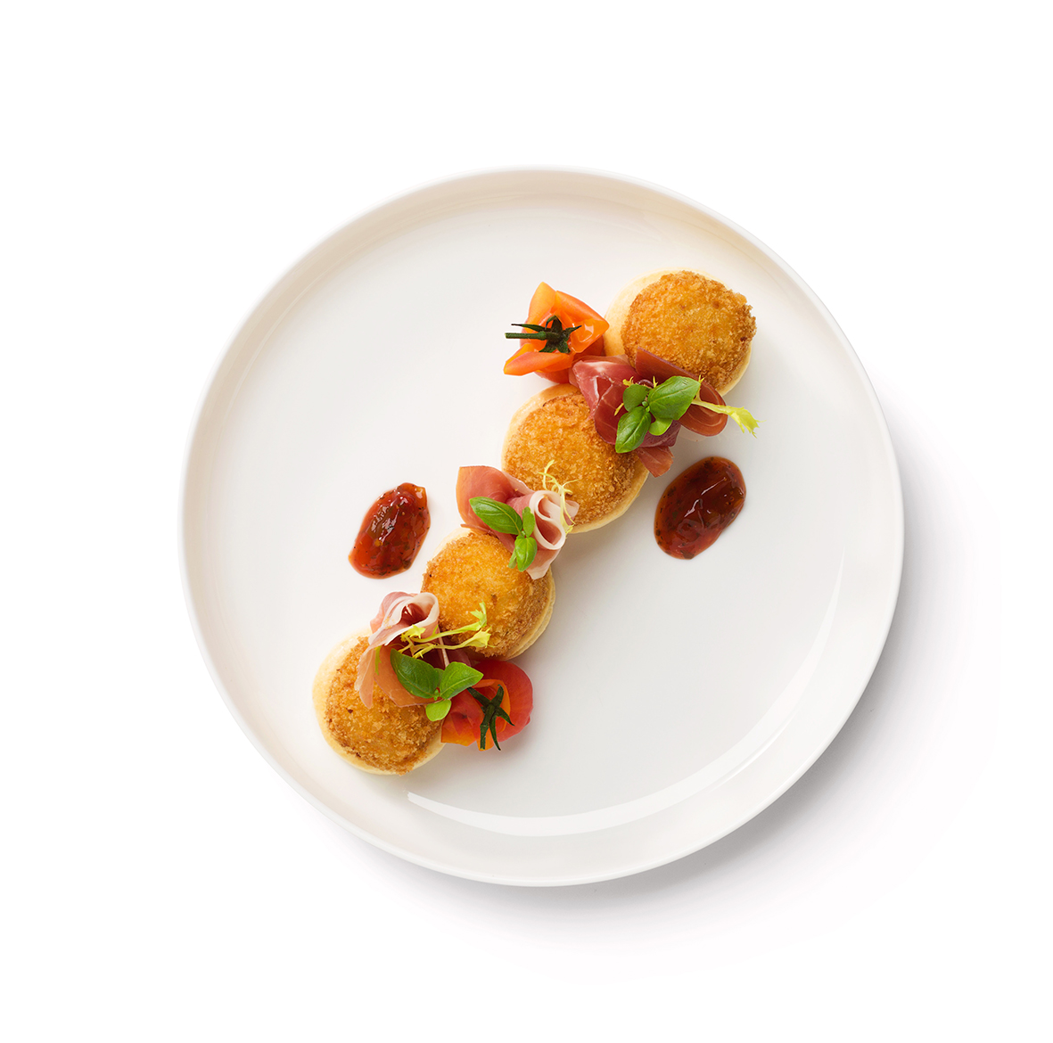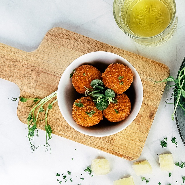 The aged cheese bitterbal has a distinctive, bold flavor. The rich ragout inside is made from matured North Holland cheese, giving it a subtly sharp, savory taste.