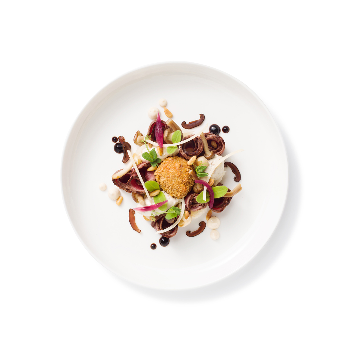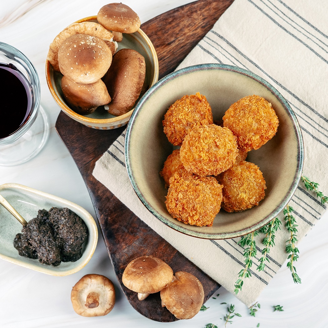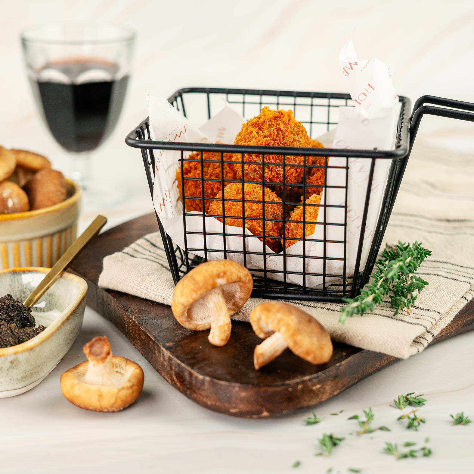 The mushroom truffle (mini) croquettes and bitterballen are entirely plant-based. Our vegan croquette is characterized by a balanced composition of brunoise-cut oyster mushrooms, porcini, shiitake, and enoki mushrooms. We’ve added 1% finely chopped Italian black truffle for a luxurious touch.
