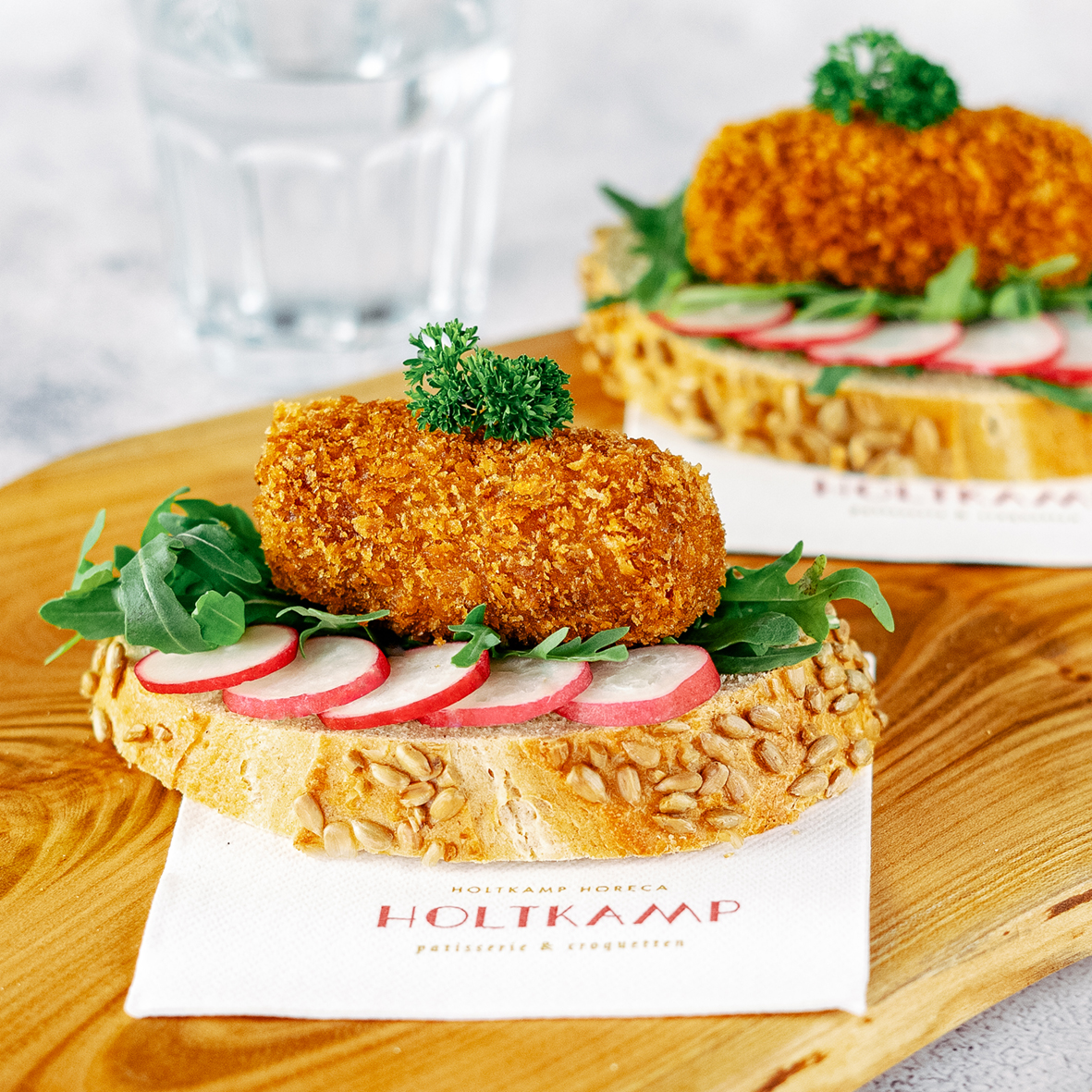 This croquette or bitterbal is characterized by its full-flavored filling and, as always, the signature thin, crispy Holtkamp breadcrumb crust.