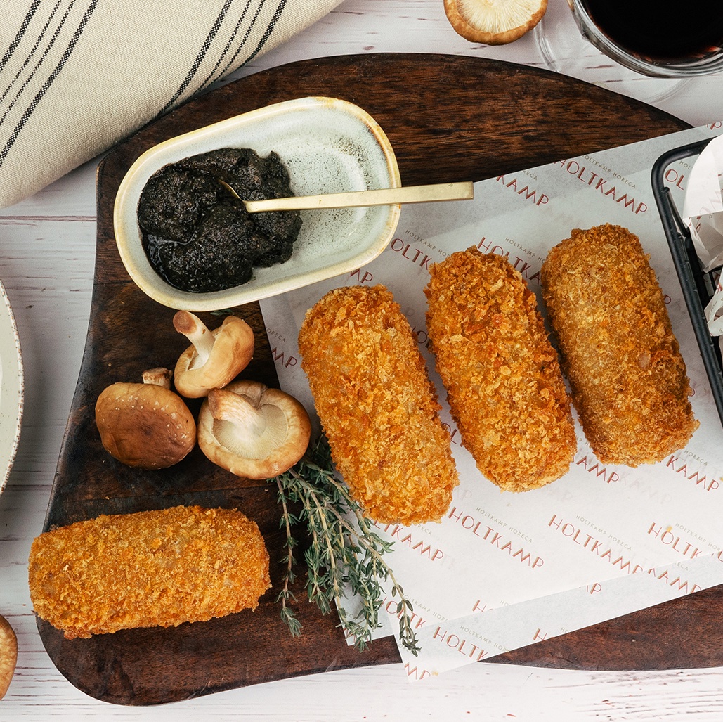 The mushroom truffle (mini) croquettes and bitterballen are fully plant-based. Our vegan croquette is characterized by a balanced composition of finely diced oyster mushrooms, porcini, shiitake, and nameko mushrooms. The shiny, plant-based mushroom ragout is enriched with 1% finely chopped Italian black truffle.