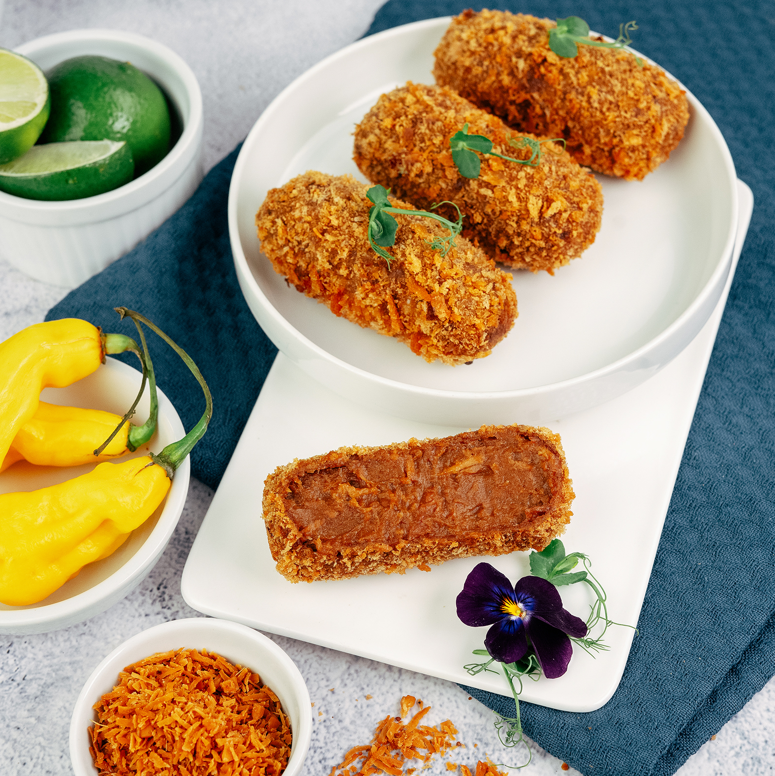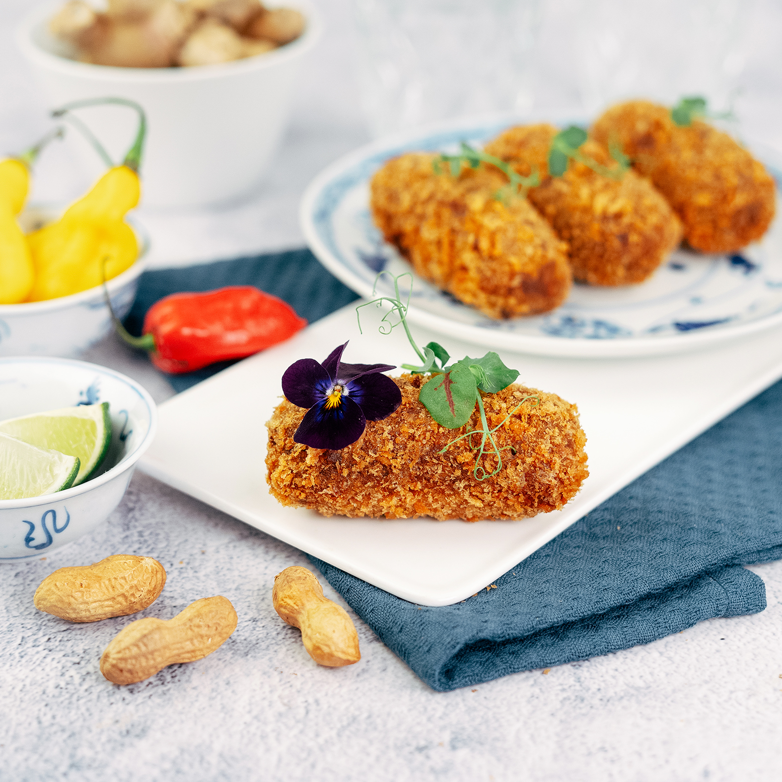 This blend of Southeast Asian flavors makes the Sateh Ayam croquette truly unique. The thin, crispy crust gives this distinctive product a pleasant bite.