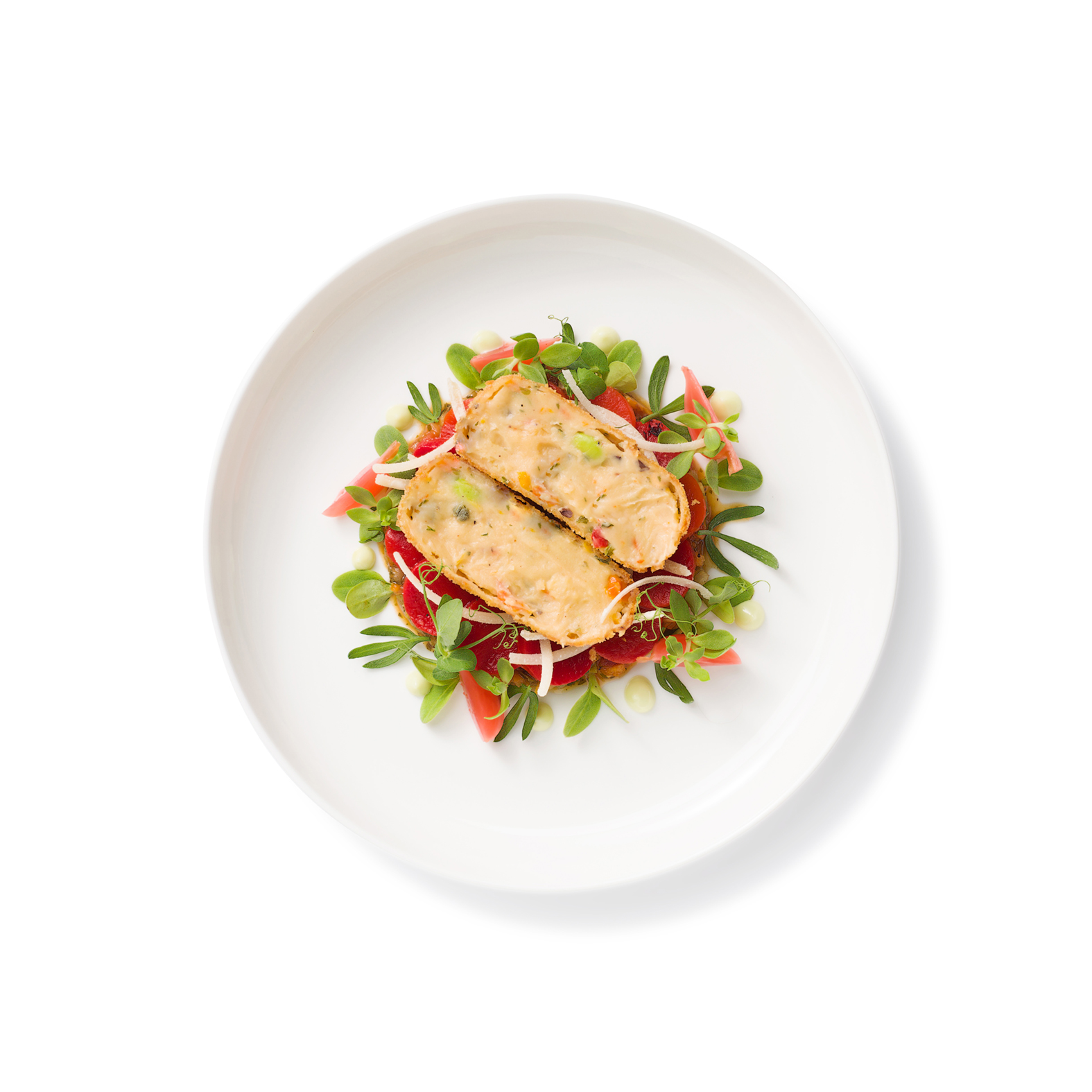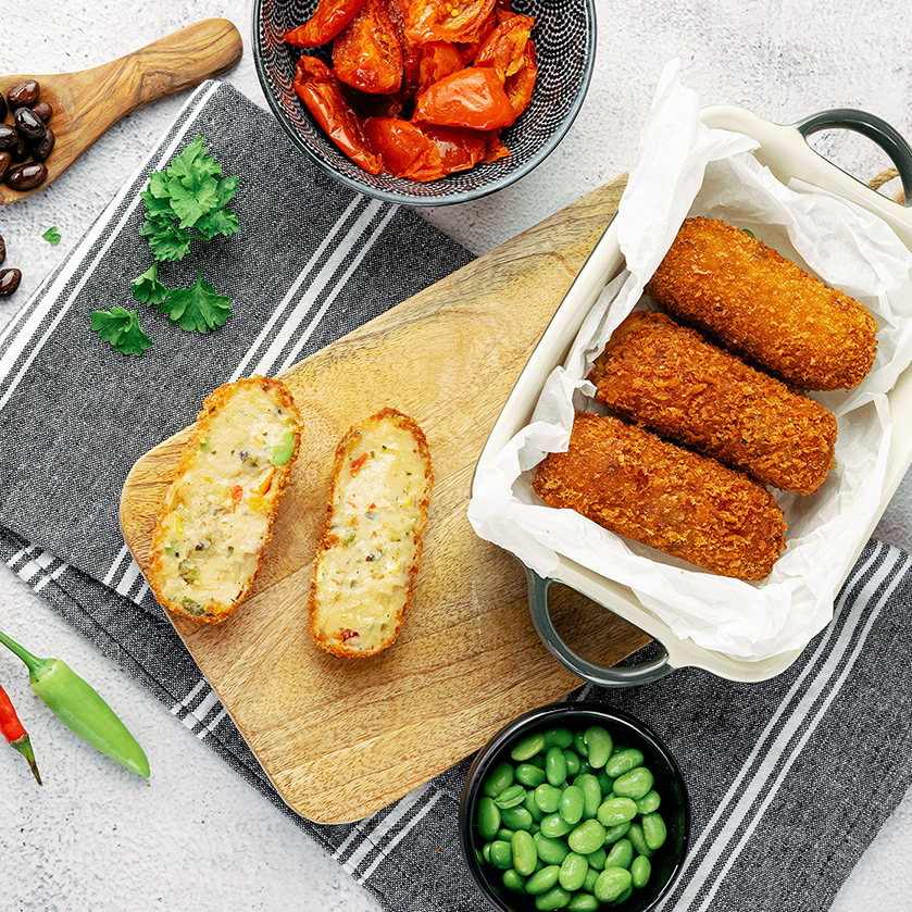 The vegetable croquette from Holtkamp Horeca has a filling made with a strong vegetable broth. It is enriched with vegetables like roasted red and yellow bell peppers, sun-dried tomatoes, onions, garlic and edamame. A delightful combination of sweet, sour, and savory flavors.