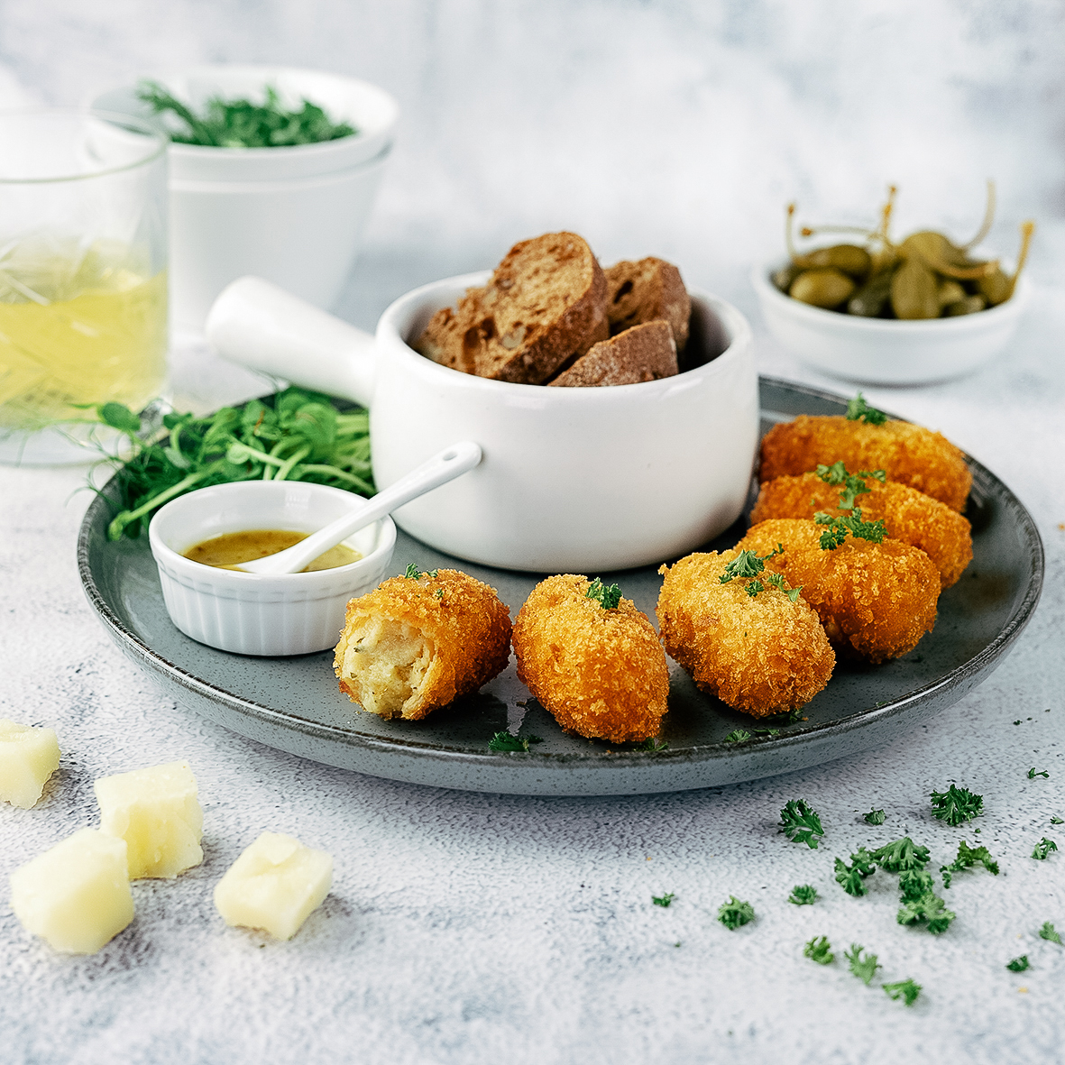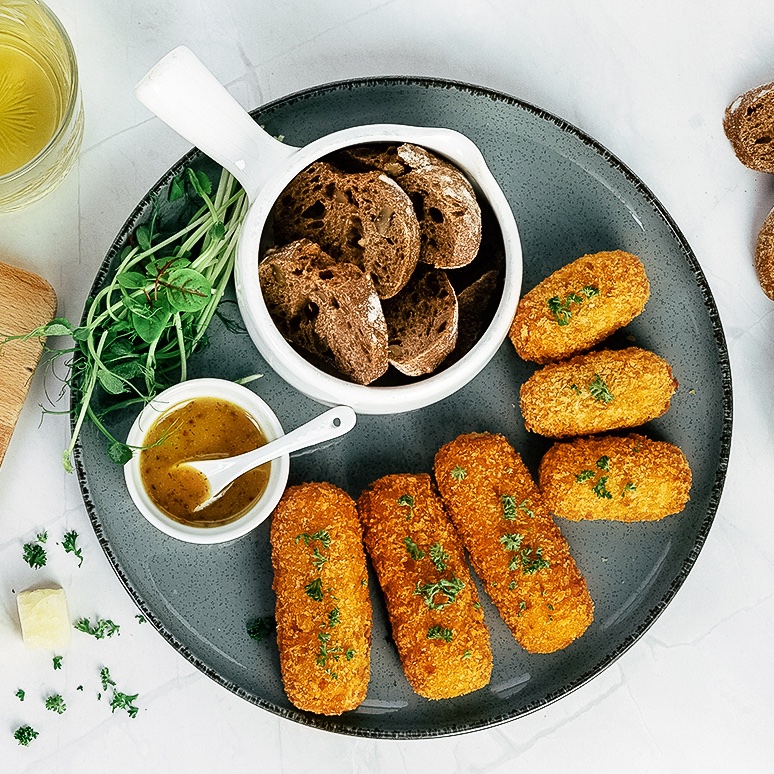The distinct flavor of the aged cheese blend provides a deep and satisfying taste. Perfectly suited to bold beers and fine wines. Available as (mini) croquettes and bitterballen with our unique thin, crispy crust.