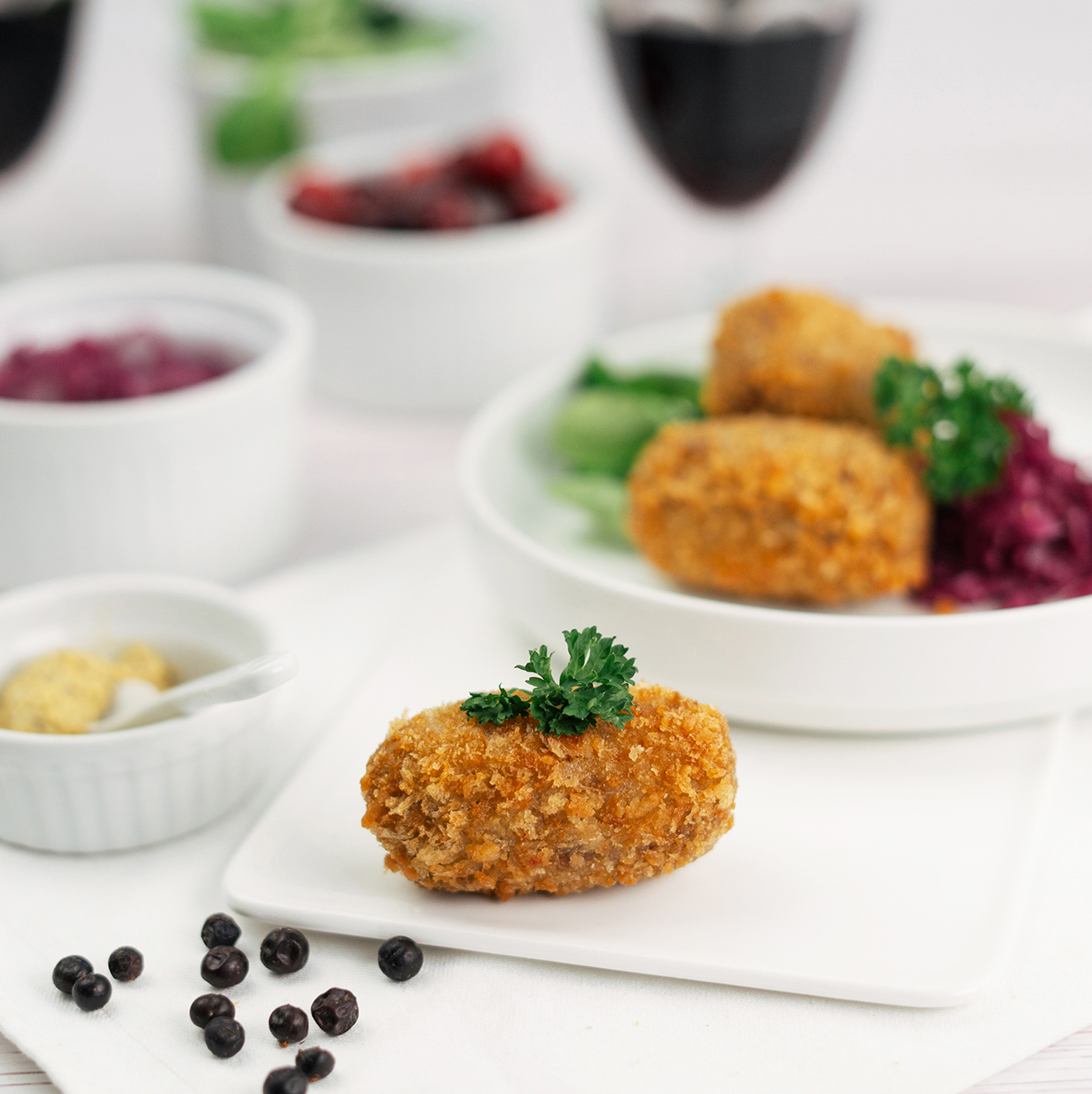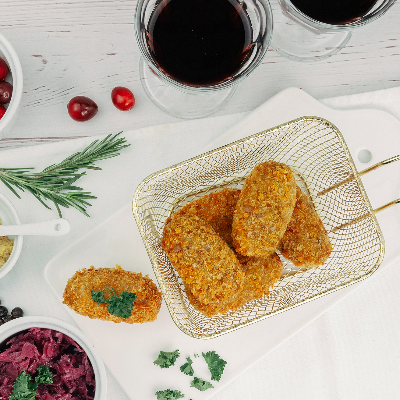Holtkamp Horeca’s game meat bitterballen and mini croquettes are a seasonal specialty. The salpicon is made with fresh game stock, European venison, red wine, onions, juniper berries, and gingerbread. The crispy crust gives these bitterballen a satisfying bite.