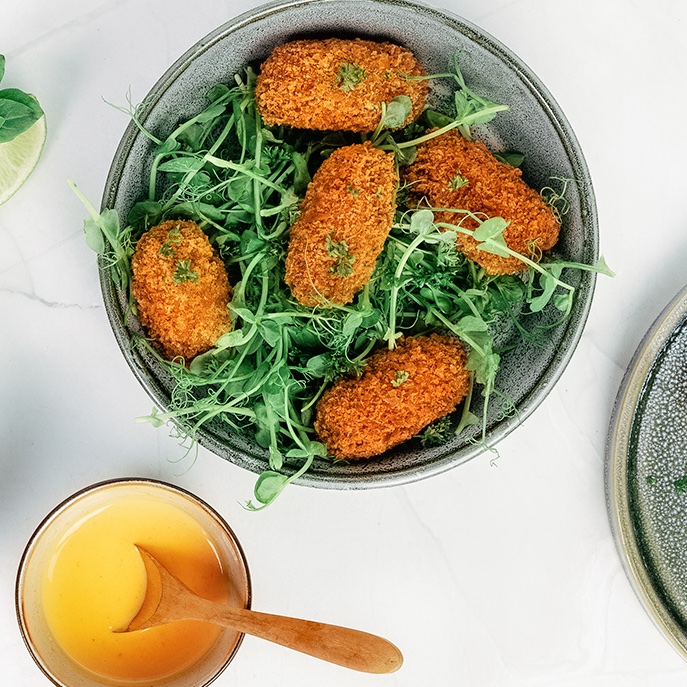 The lobster mini croquettes have a fine and subtle flavor and contains no less than 22% lobster meat. Key ingredients such as cognac, fresh garlic, and basil give the lobster croquette its refined taste.