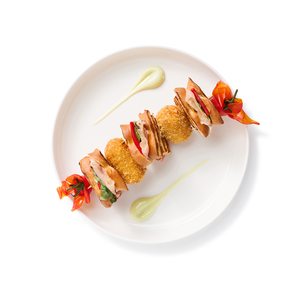 The lobster croquette/bitterball has a briny note, and the filling stands out with its color and delicate flavors of lobster, cognac, fresh garlic, and basil. The (mini) croquettes and bitterballen feature the ultra-thin, crispy breadcrumb crust.