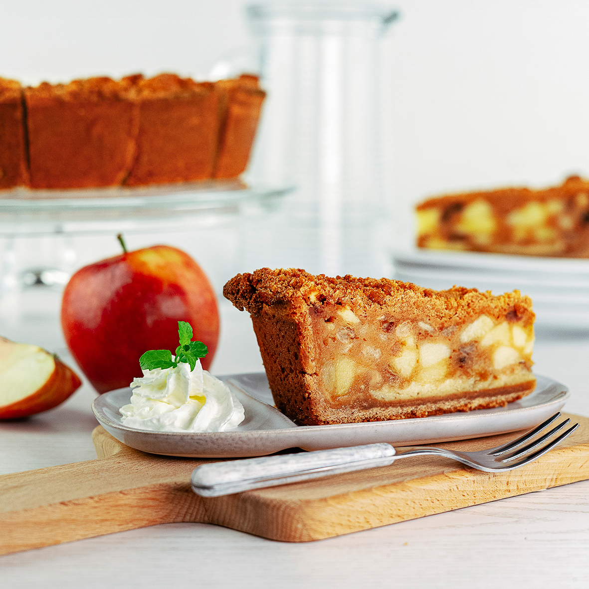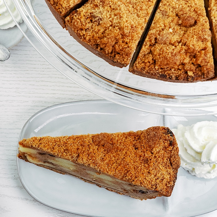 A crunchy cookie crust with a light almond paste layer. Filled with apples, raisins, currants, and a touch of cinnamon. Topped with a buttery crumble.