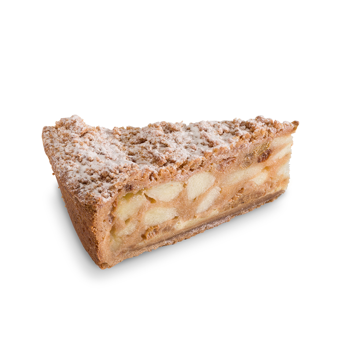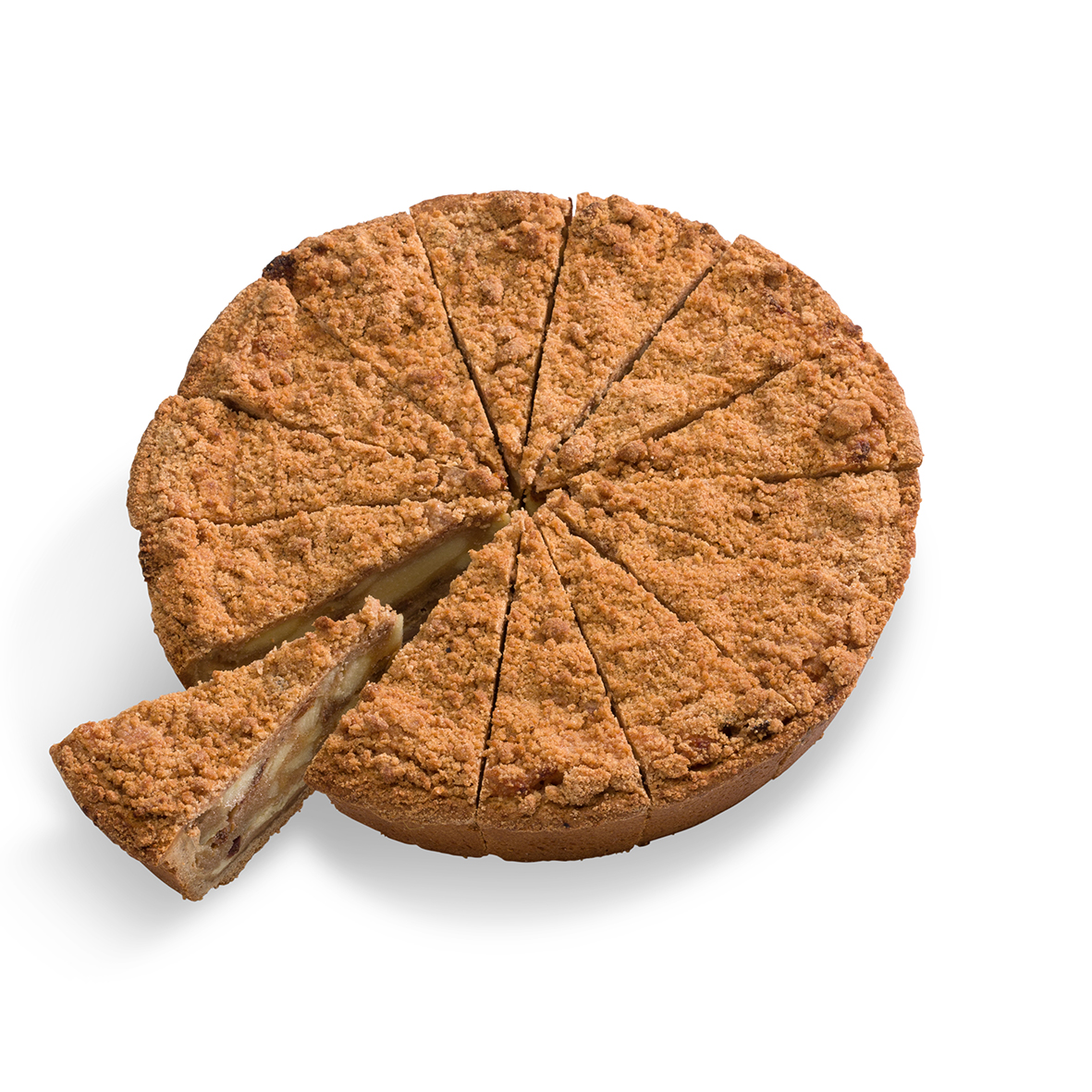 Crunchy cookie crust with a light layer of almond paste. Filled with apples, raisins, currants, and a touch of cinnamon. Finished with crumble topping.