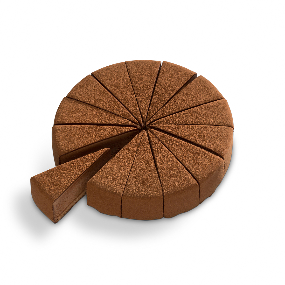Base of crispy feuilletine and chocolate sponge. Filled with chocolate bavaroise, glazed with dark ganache, and finished with piped dark chocolate.