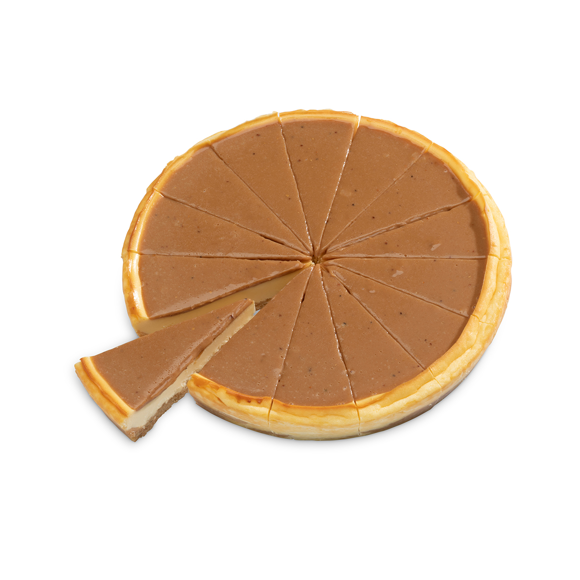 Buttery crumble crust with a creamy Danish cream cheese filling. Finished with bold coffee caramel and crushed coffee beans.