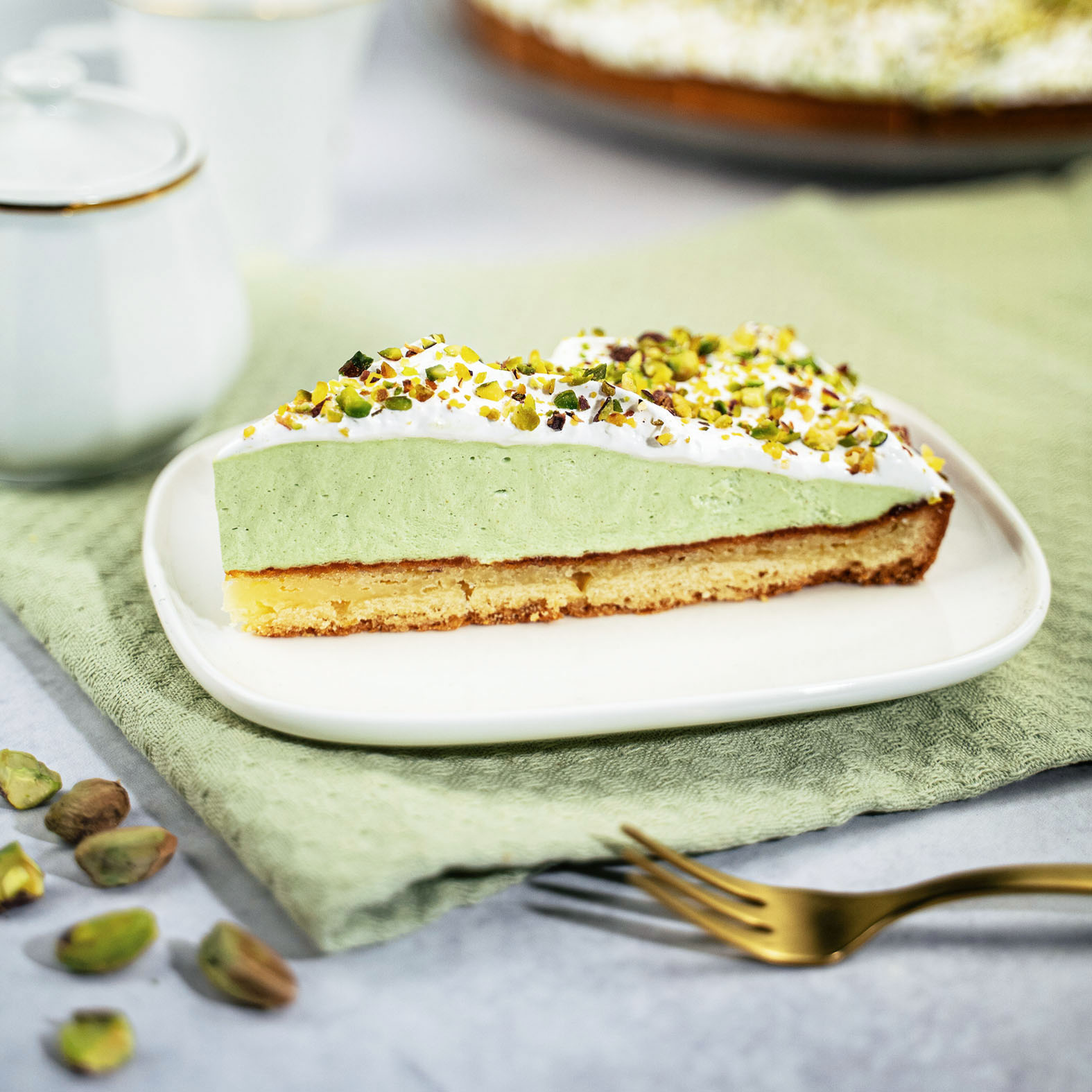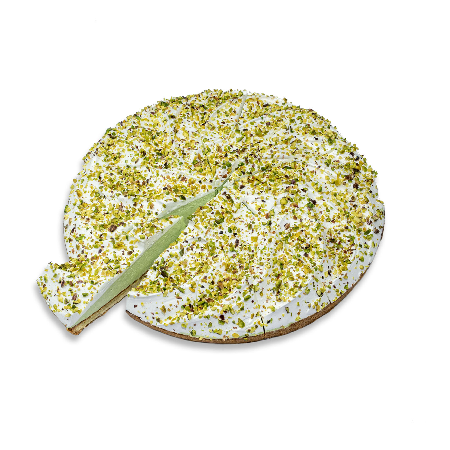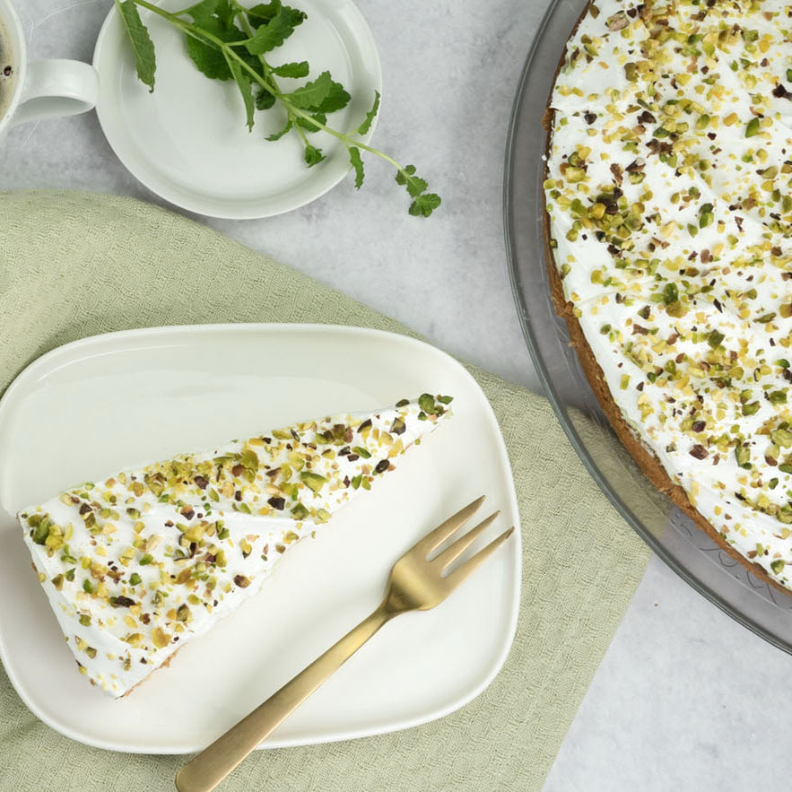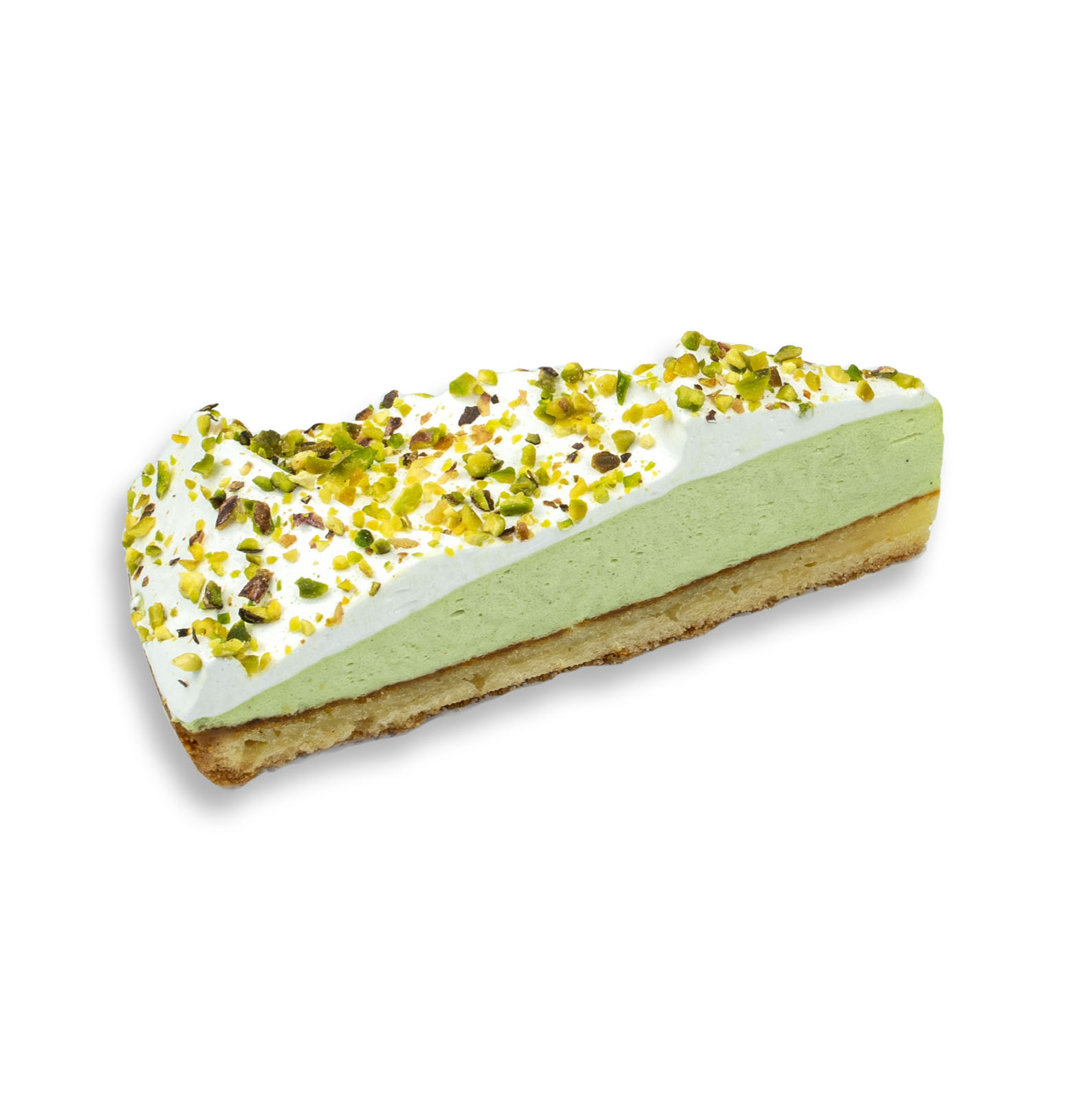 The base consists of a cookie crust filled with frangipane, topped with a light and airy pistachio bavarois. It is decorated with fluffy meringue foam and sprinkled with pieces of freshly roasted pistachios.