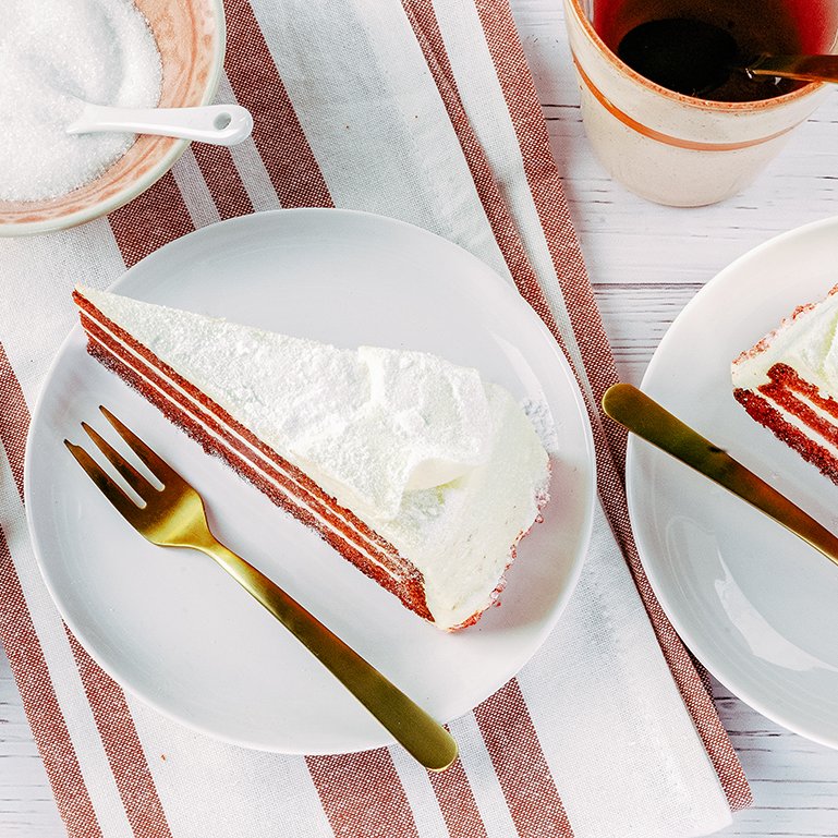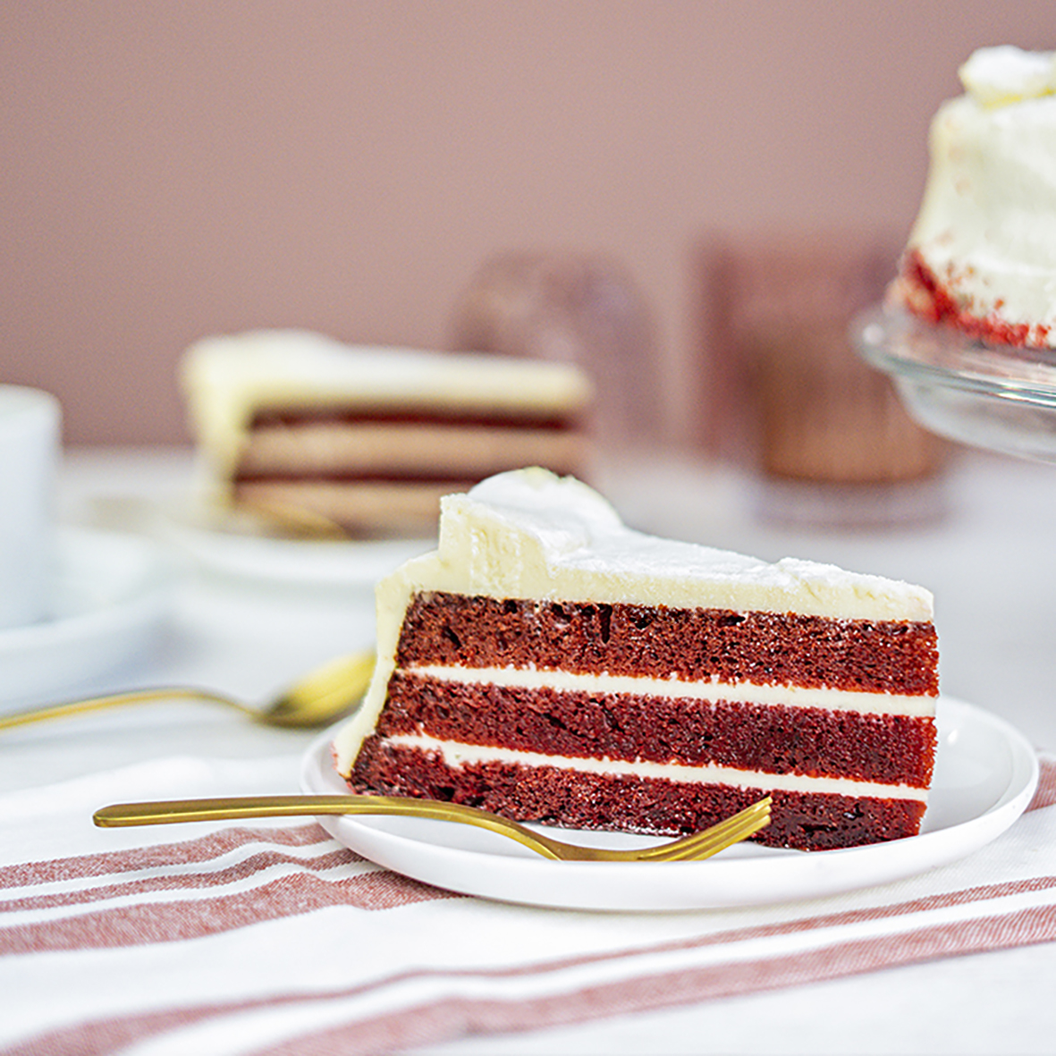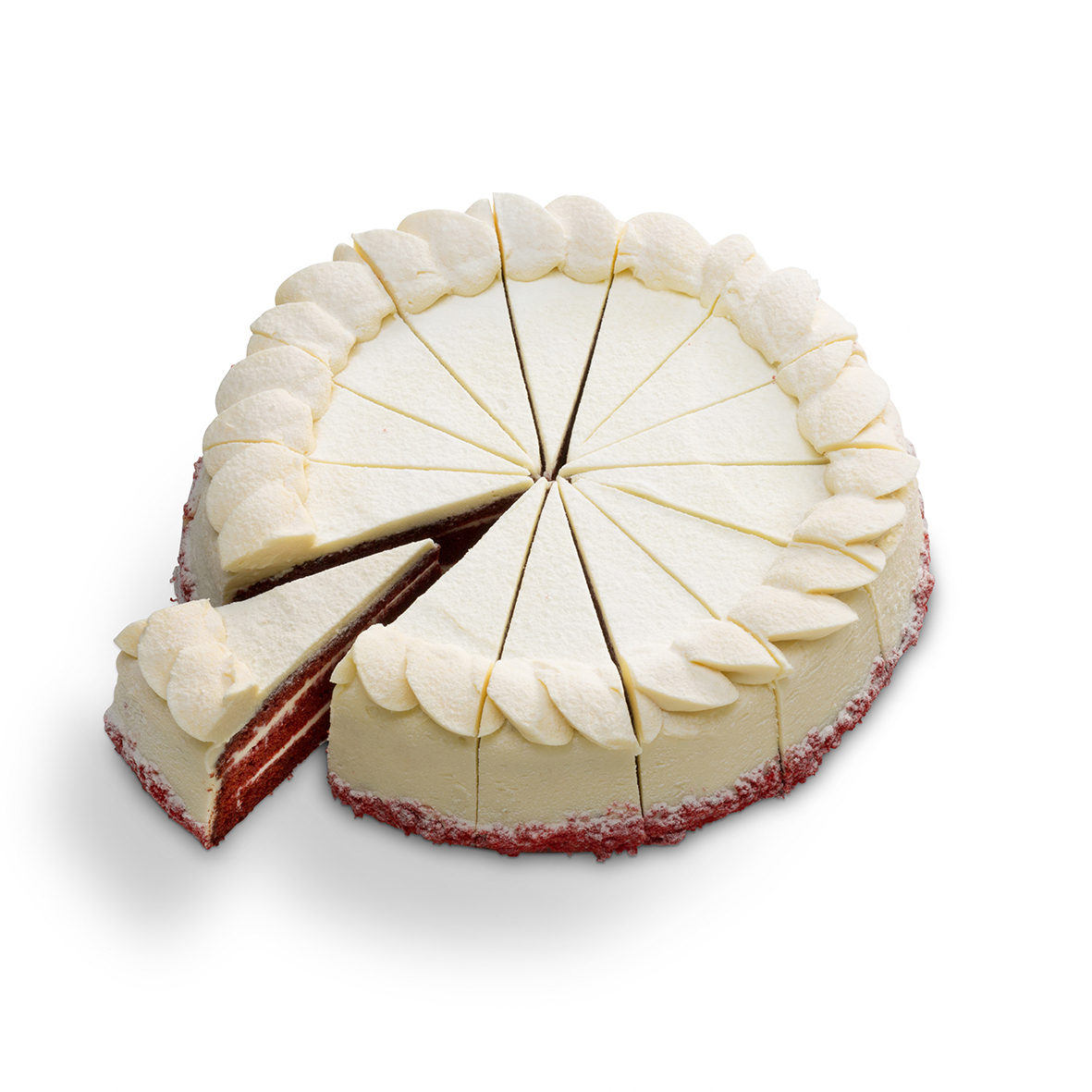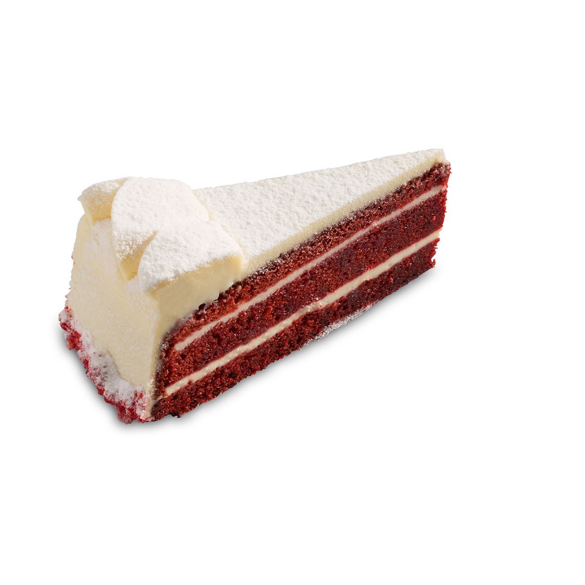 Moist red velvet cake, double-filled and frosted with light cream cheese. Finished with powdered sugar.