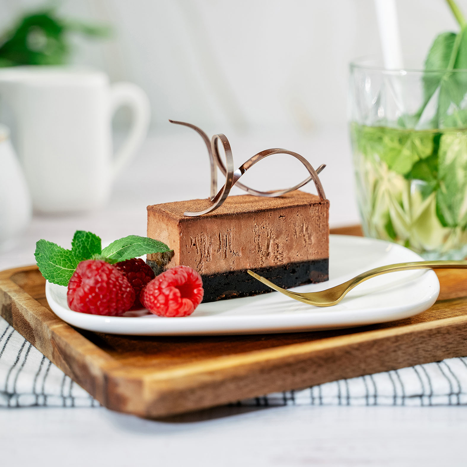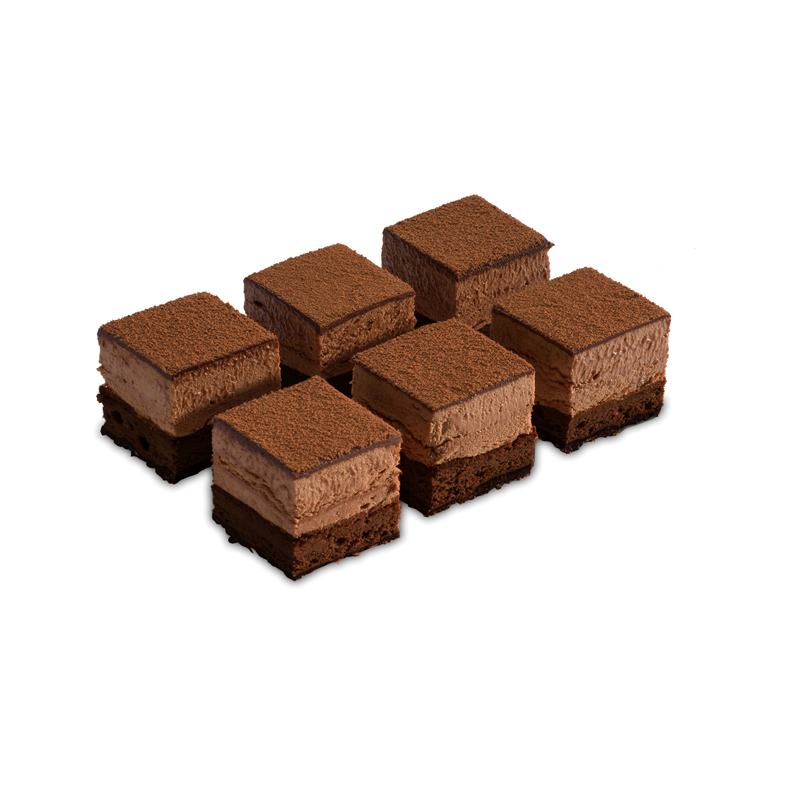 Moist brownie with dark chocolate, filled with airy chocolate mousse, glazed with ganache, and finished with cocoa velvet spray.