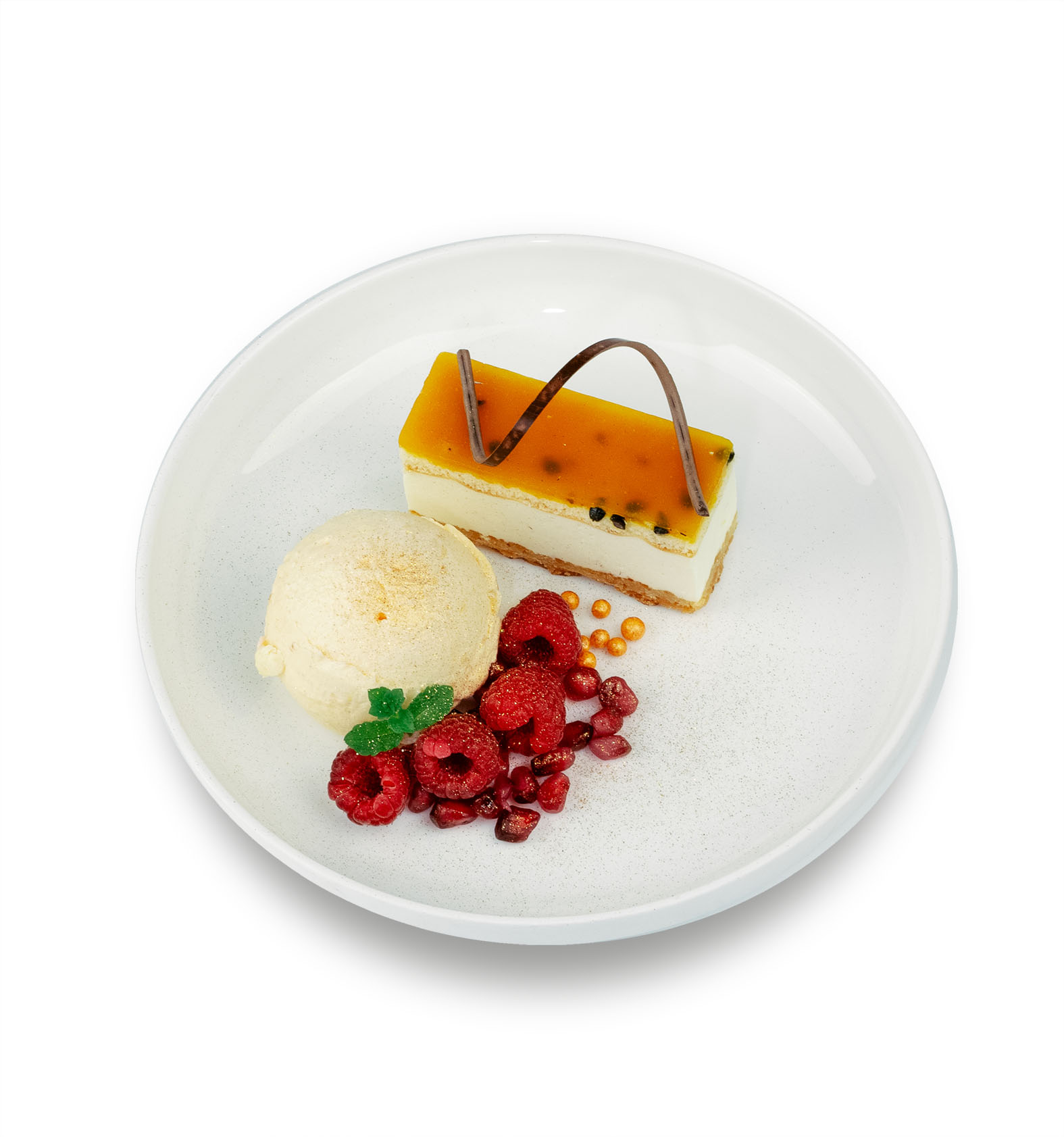 Cookie base with frangipane. Topped with a light white chocolate bavarois. Decorated with a glaze of whole passion fruit with a hint of mango purée.