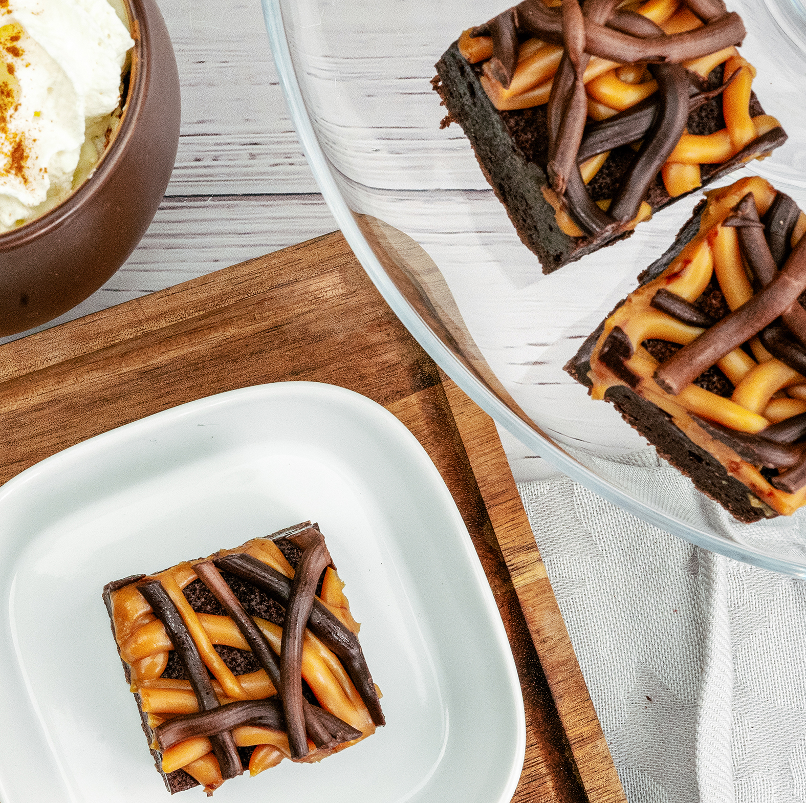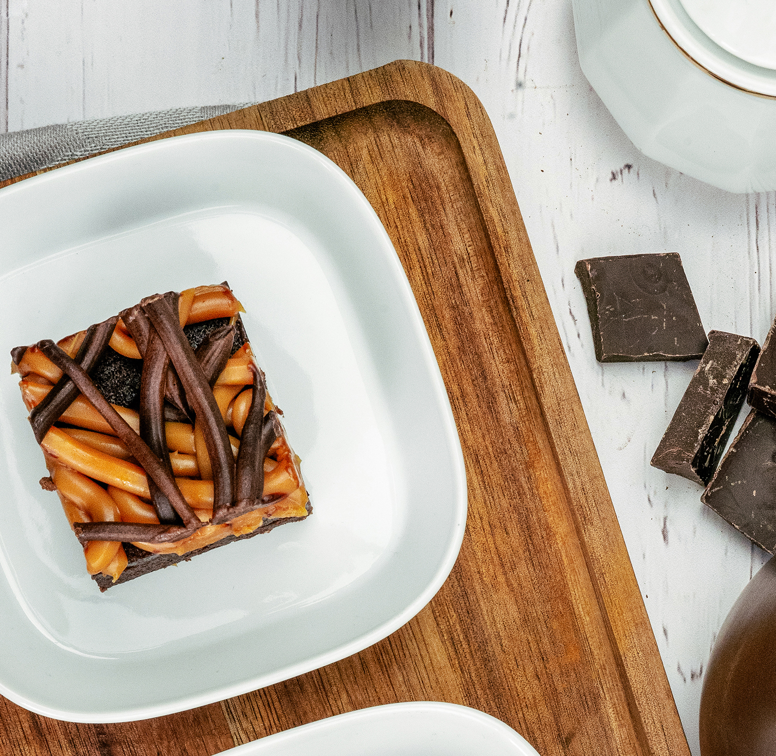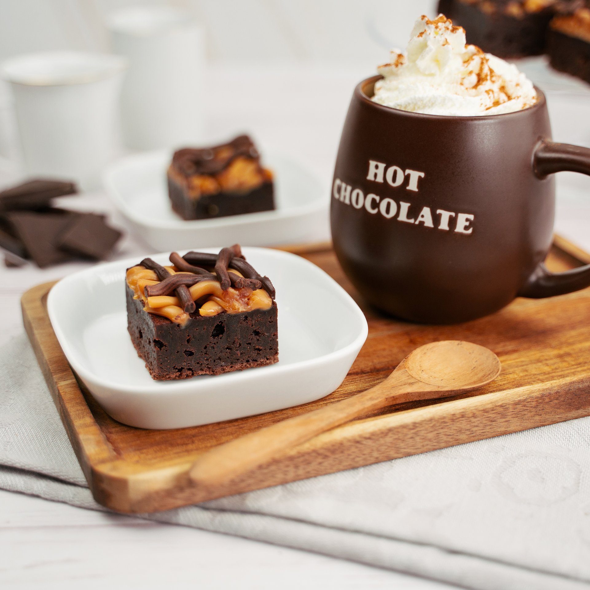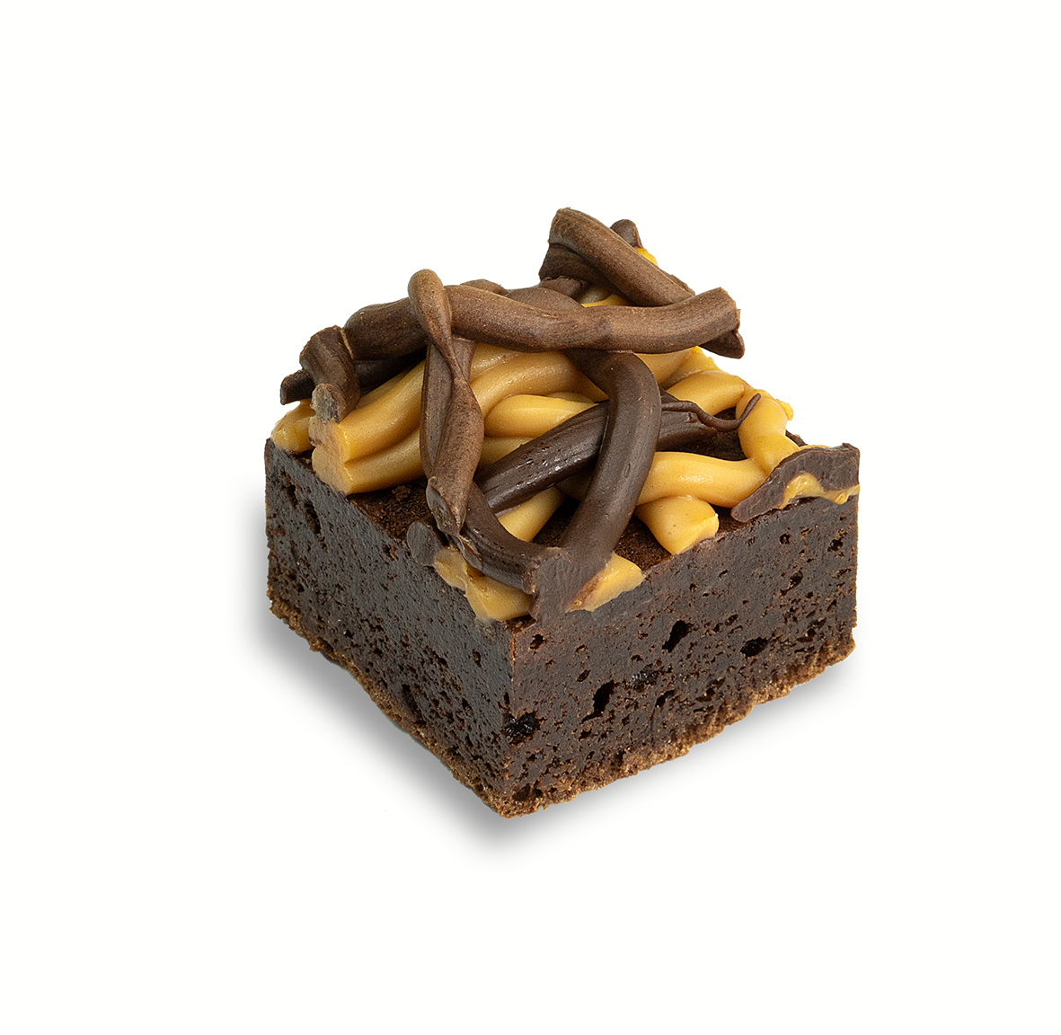 A rich, moist brownie with dark chocolate, topped with salted caramel toffee and dark chocolate ganache.