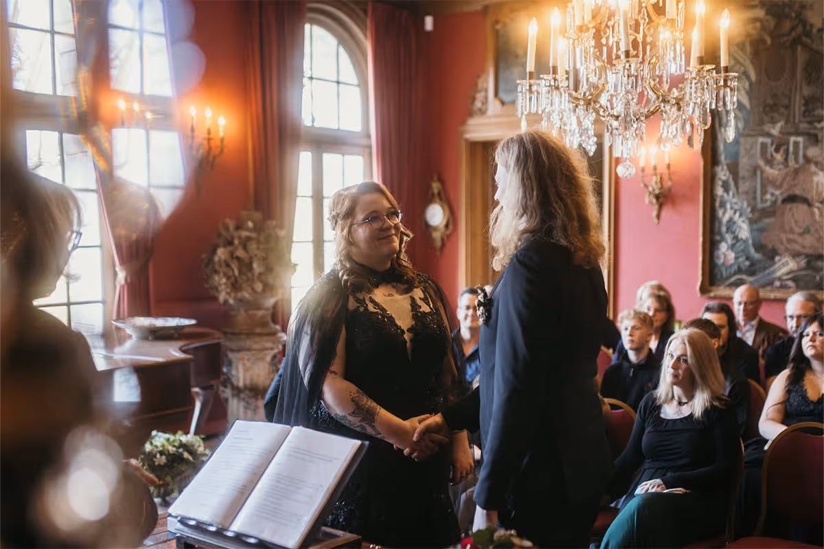Bine maakte haar opwachting in een adembenemende zwarte jurk, compleet met een indrukwekkende sleep en een doorzichtige voile cape. Een beeld dat je zó in een film zou verwachten. Geen klassieke witte sluier, maar wel pure klasse. En het moment dat ze elkaar voor het eerst zagen bij de ceremonie… zó intens, zó echt. Niels kon zijn emoties nauwelijks bedwingen. En dat snap ik helemaal.