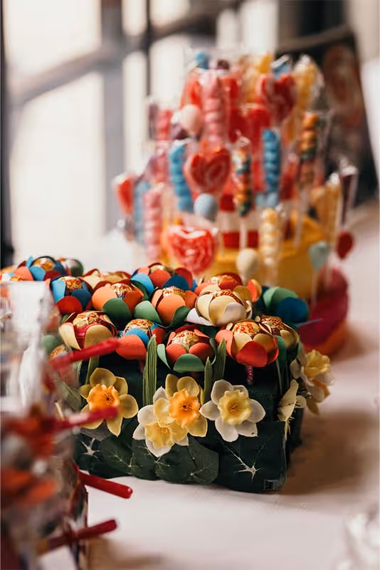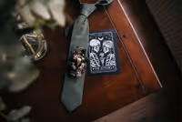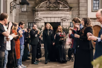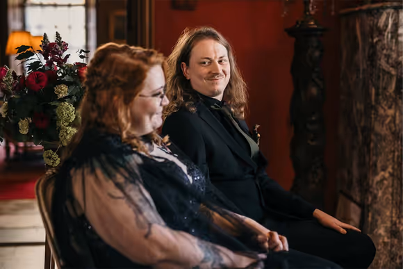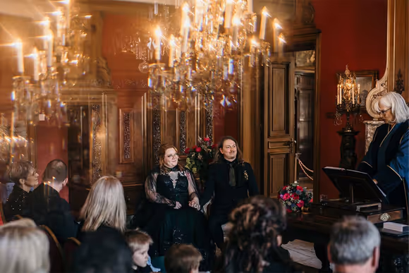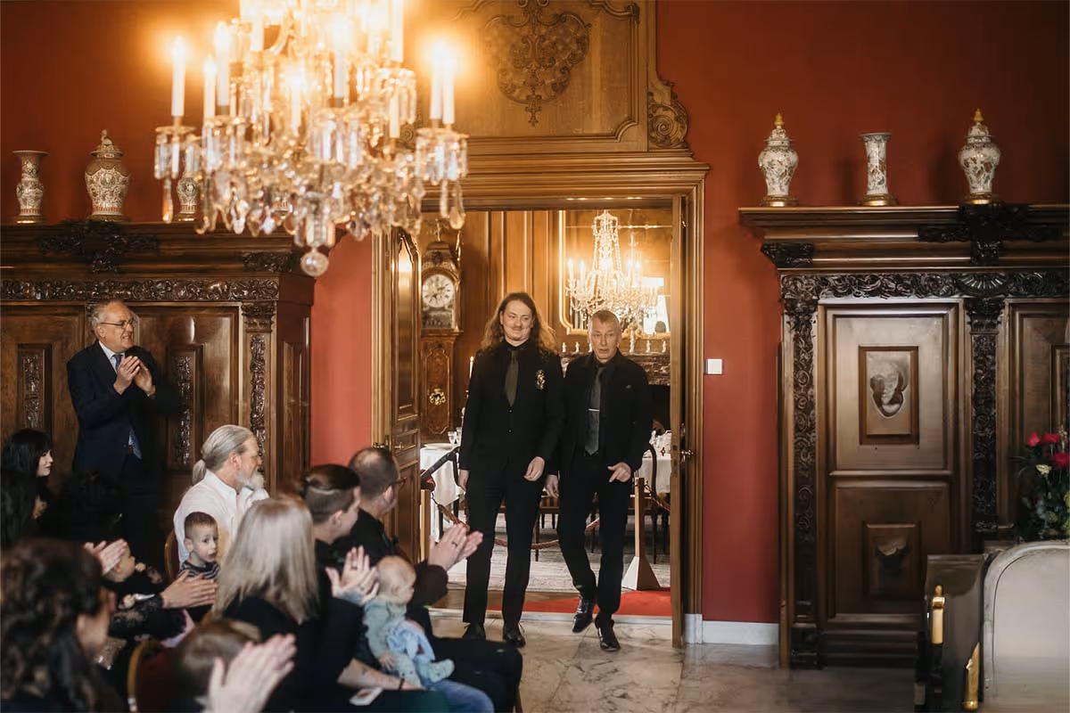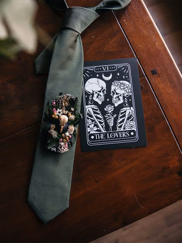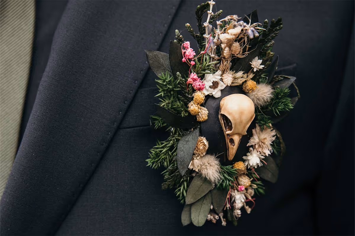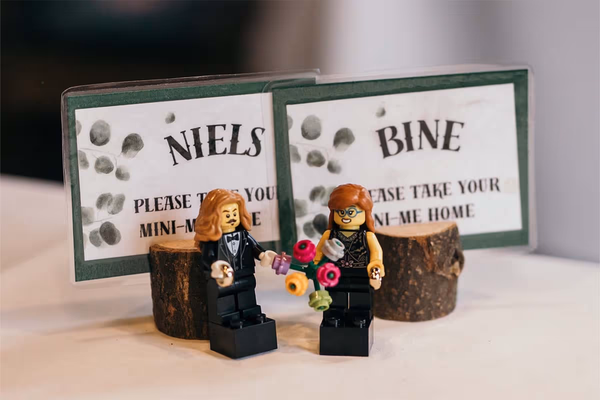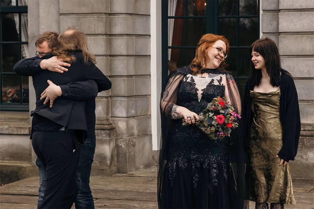 De trouwdag brak aan. De locatie? Het sfeervolle Kasteel Singraven, dat met zijn oude charme perfect contrasteerde met de eigenzinnige stijl van het bruidspaar. Niels verscheen in een volledig zwart trouwpak, afgewerkt met een corsage die je niet snel vergeet: een klein skelethoofdje, versierd met bloemen. Stijlvol met een knipoog, precies zoals zij zijn.