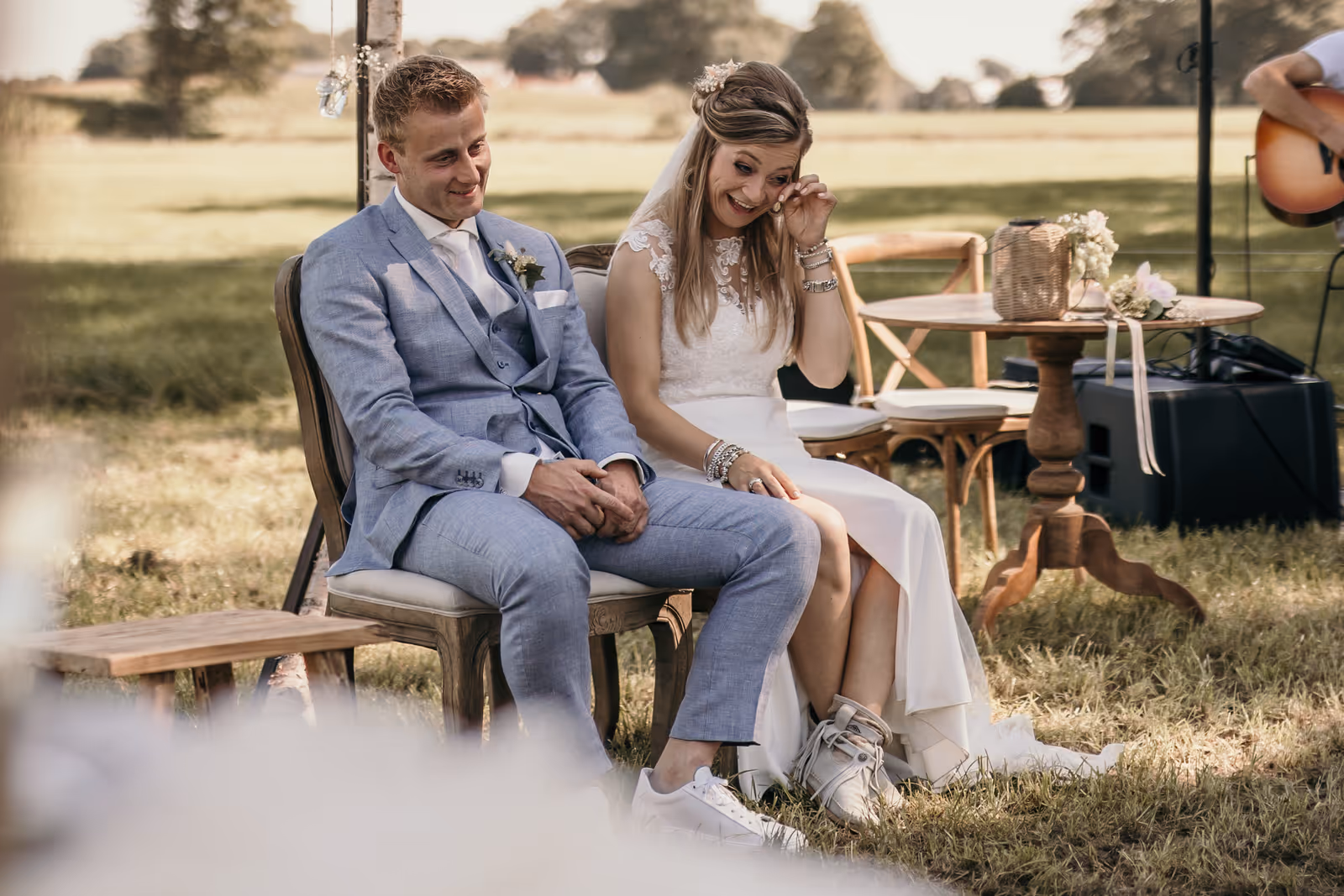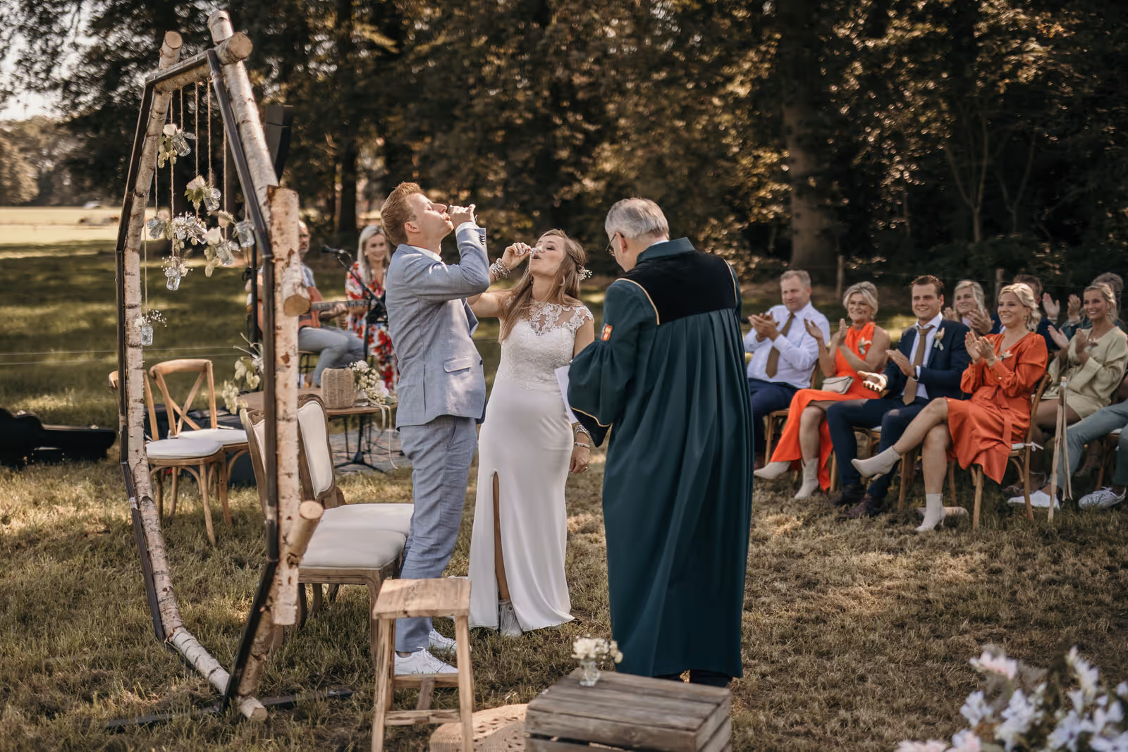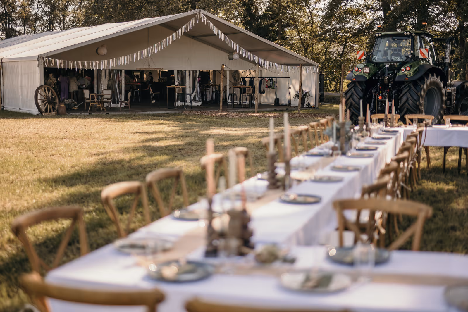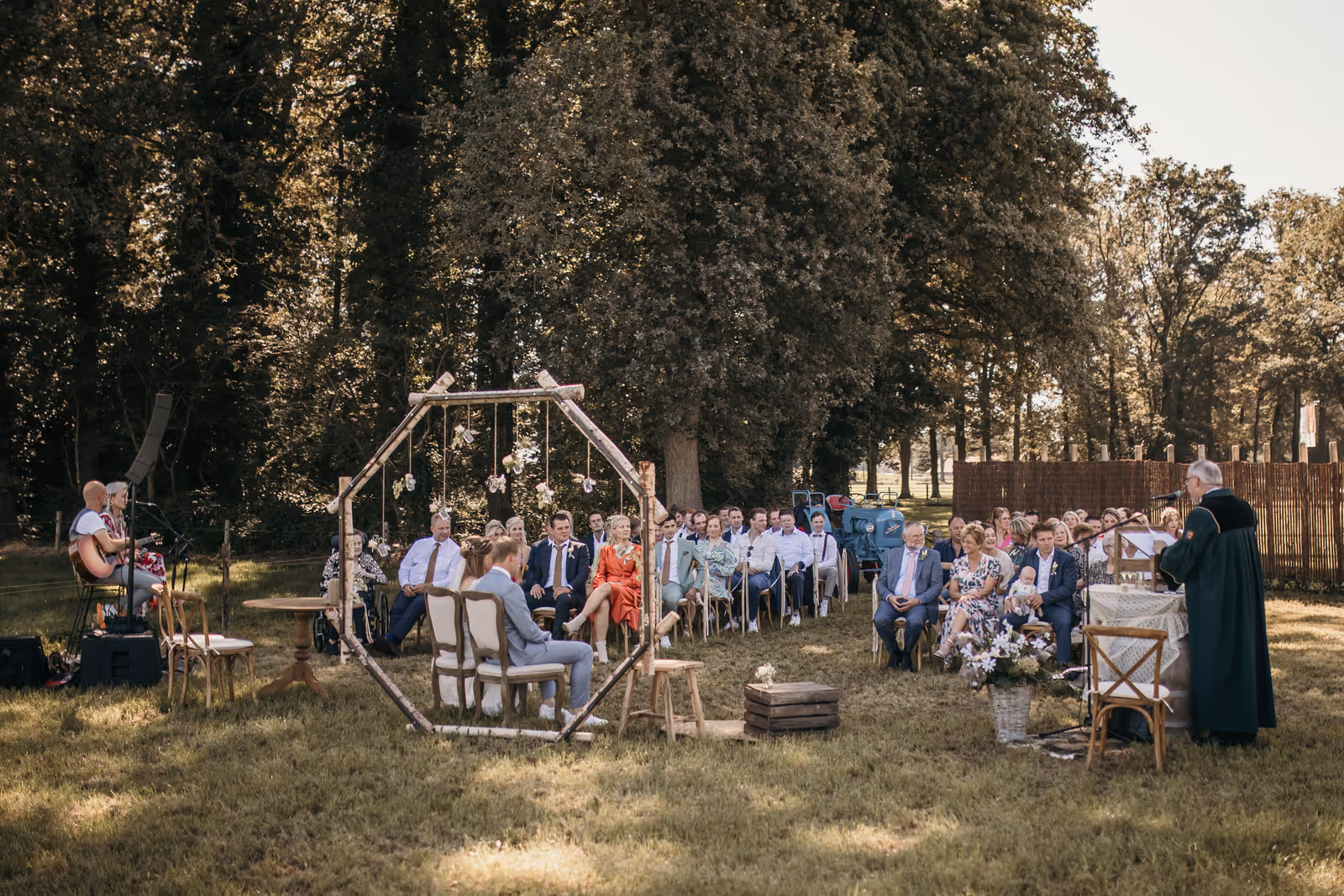Jelle en Lotte wonen op een prachtige locatie, en nagenoeg buitenaf. Het sprak dan ook voor zich dat daar de ceremonie plaatsvond en ze daar groots feest wilden vieren met familie en vrienden. En laten we eerlijk zijn, hoe fijn is het als het in je eigen achtertuin kan? Lotte is zelf erg creatief, en had met hulp van een paar vrienden en familie het terrein geheel omgebouwd tot prachtig festivalterrein.