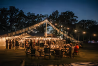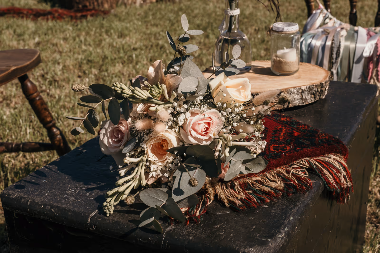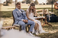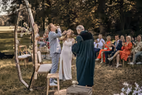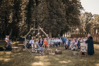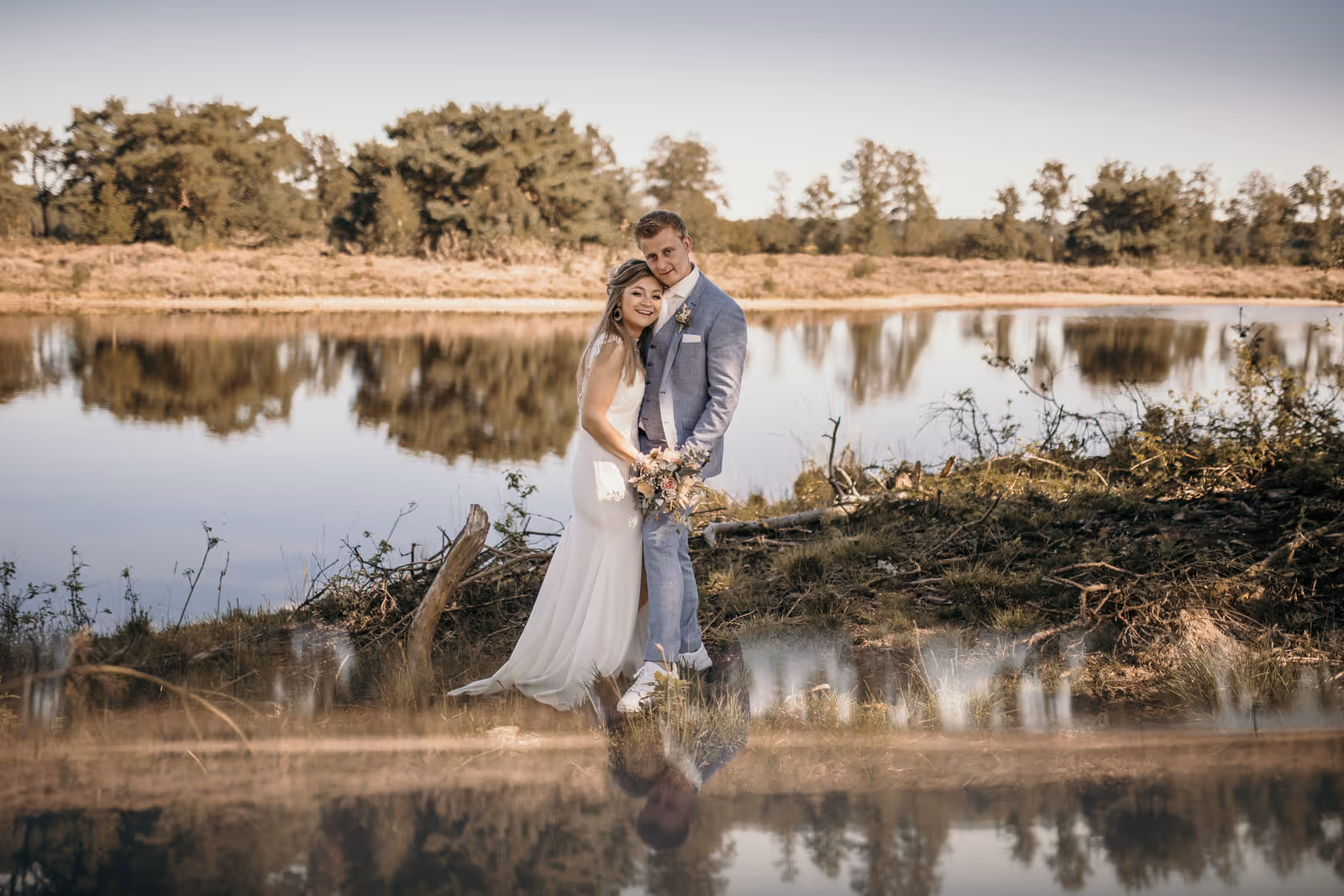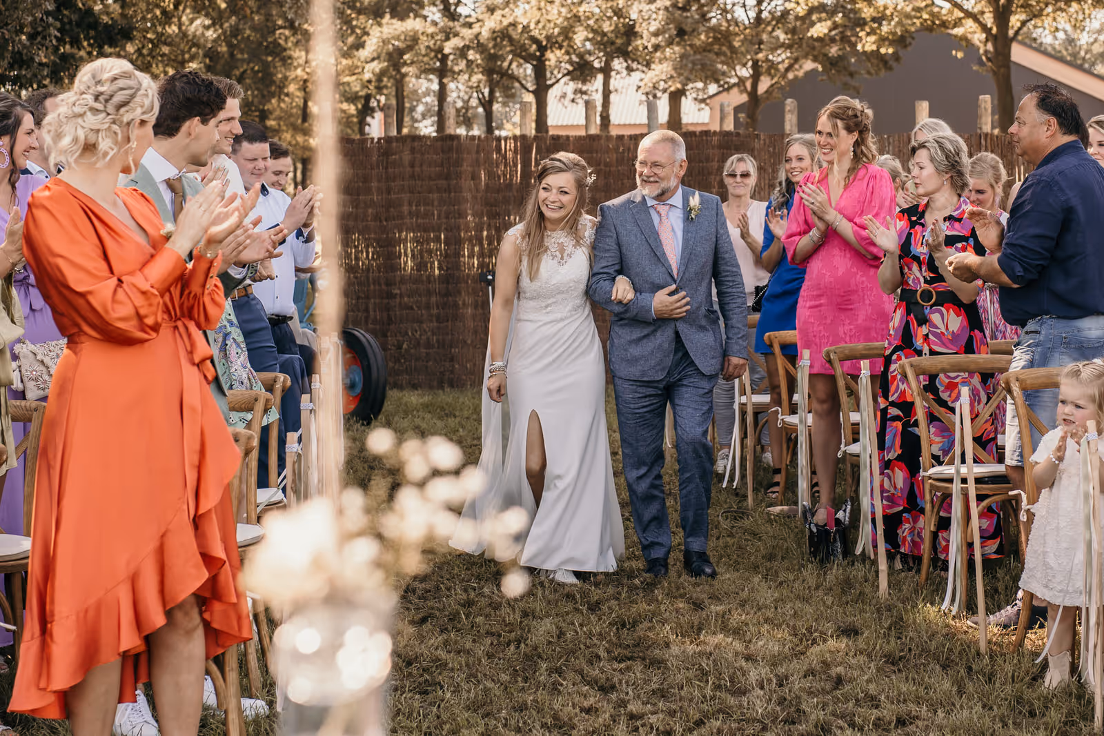 Jelle en Lotte wonen op een prachtige locatie, en nagenoeg buitenaf. Het sprak dan ook voor zich dat daar de ceremonie plaatsvond en ze daar groots feest wilden vieren met familie en vrienden. En laten we eerlijk zijn, hoe fijn is het als het in je eigen achtertuin kan? Lotte is zelf erg creatief, en had met hulp van een paar vrienden en familie het terrein geheel omgebouwd tot prachtig festivalterrein.