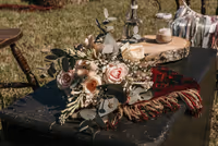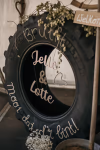 Overal waar je keek was er wel een persoonlijke touch in de aankleding. Van strobalen tot zelfgemaakte welkomstborden, van melkbussen tot bloemwerk in de tent en op tafels.