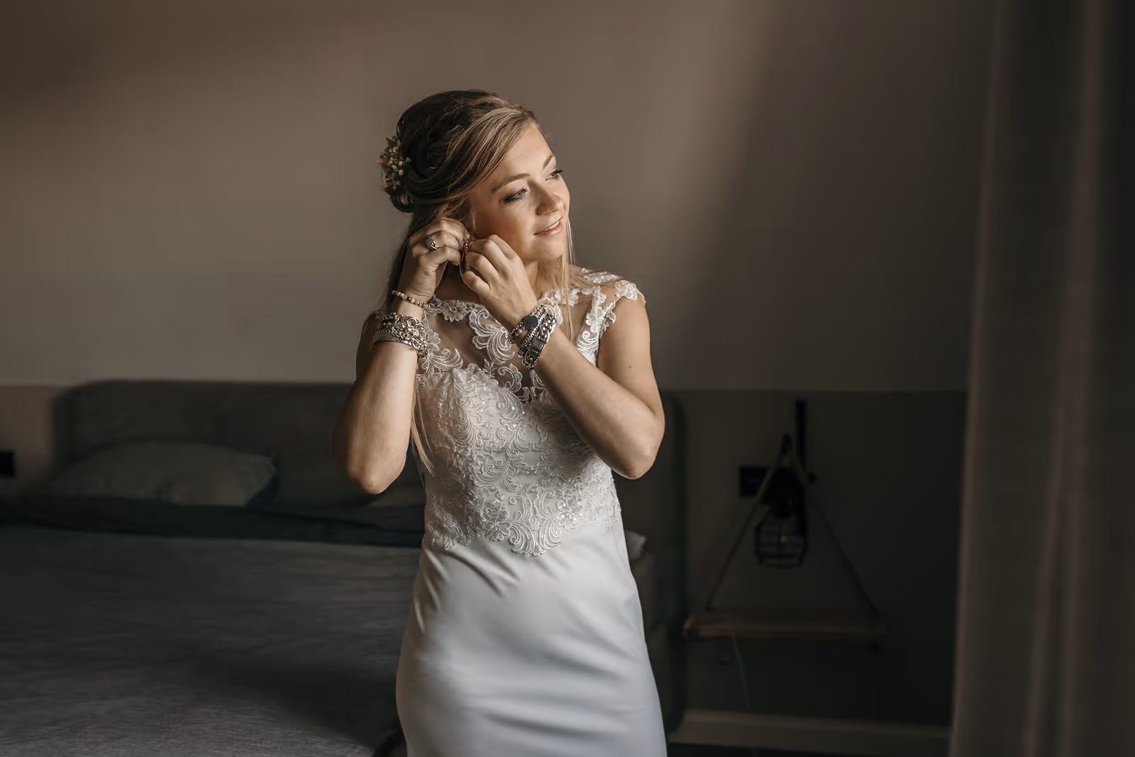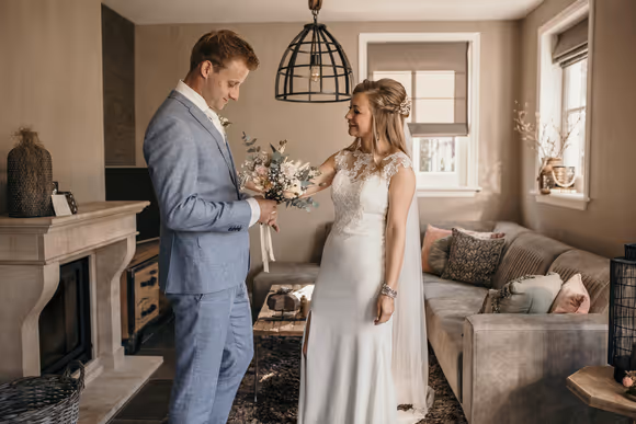 De ochtend van hun huwelijk begon heerlijk rustig, geen zenuwachtige toestanden, en wellicht ook mede door de nuchtere inslag van dit mooie stel. Geheel in stijl kwam Jelle zijn Lotte ophalen met een grote trekker, om daarna geheel in stijl aan te komen bij de ceremonie op het festivalterrein.