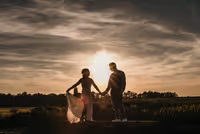 De dag werd afgesloten met een heerlijk diner in de buitenlucht, waarna het grote avondfeest kon beginnen. Maar niet voordat Danielle het bruidspaar nog gauw 10 minuten had meegenomen naar een maisveld naast het festivalterrein. De zon ging onder en dat was voor mij het ultieme moment om prachtige foto's van Jelle en Lotte te maken. Zo blij dat ze dit nog hebben kunnen doen voor al het feestgedruis!