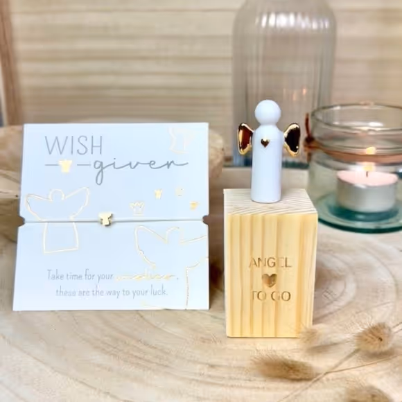 Verras haar met een giftset, deze giftset bevat een klein engeltje van porselein die overal mee naartoe kan om jouw geliefde te beschermen. Daarnaast bevat de giftset een wit armbandje met een goudkleuring engeltje met de tekst ‘Take time for your wishes, these are the way to your luck’. Het armbandje is nikkelvrij, het engeltje is gemaakt van stainless steel met een 14K gouden laagje. Een heel mooi cadeautje om jouw liefde mee te verrassen.